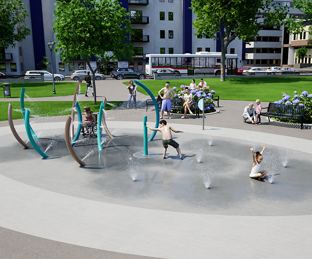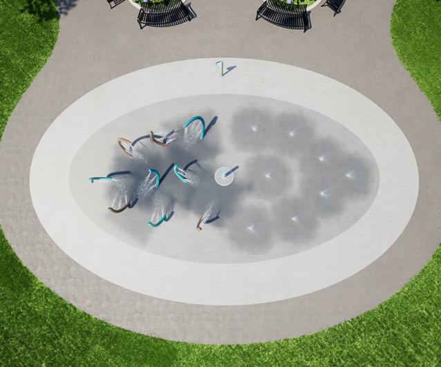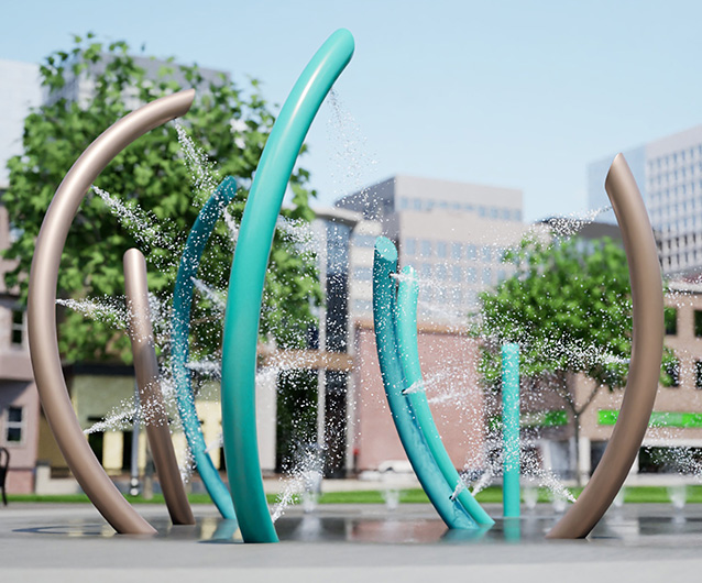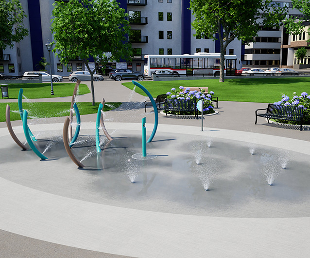 Art installation or splash pad? The choice is for passersby interested in cooling down with a fine mist. This package features unique archway passages that give a whole-body mist to visitors of all ages and abilities. Ground misting features provide three misting effects in an upward and outward pattern. Choose Aquatix colors based on material. A HydroLogix® User Sign is included with every package.