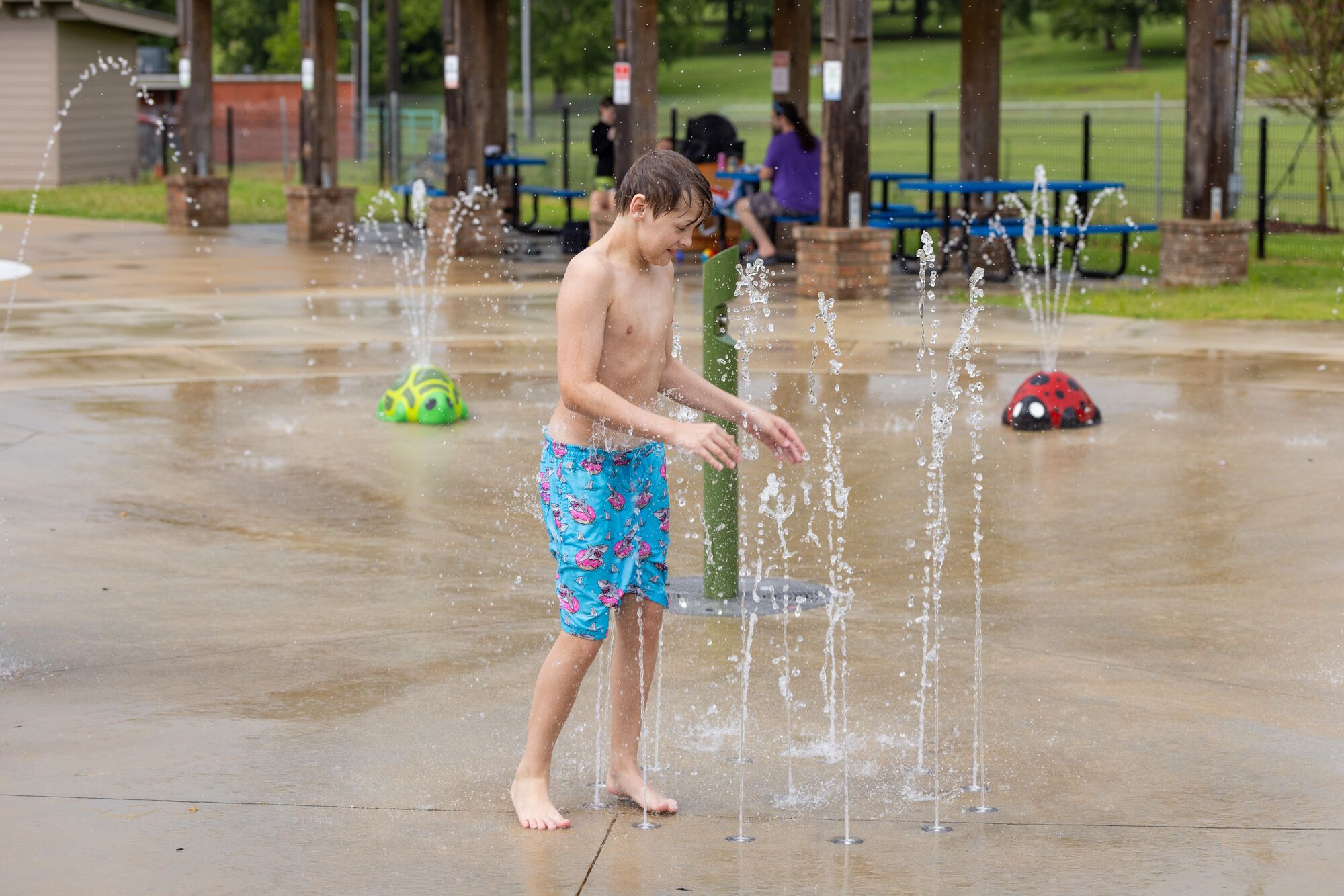 The J.L. King Senior Memorial Park Splash Pad in Starkville, Mississippi has plenty of refreshing, interactive and imagination-sparking water features to enjoy. Featuring the AquaSmart Package C, this splash pad offers whimsical glimpses of nature, with the overhead botanical LeafCrown, TotPack Turtle and TotPack LadyBug.