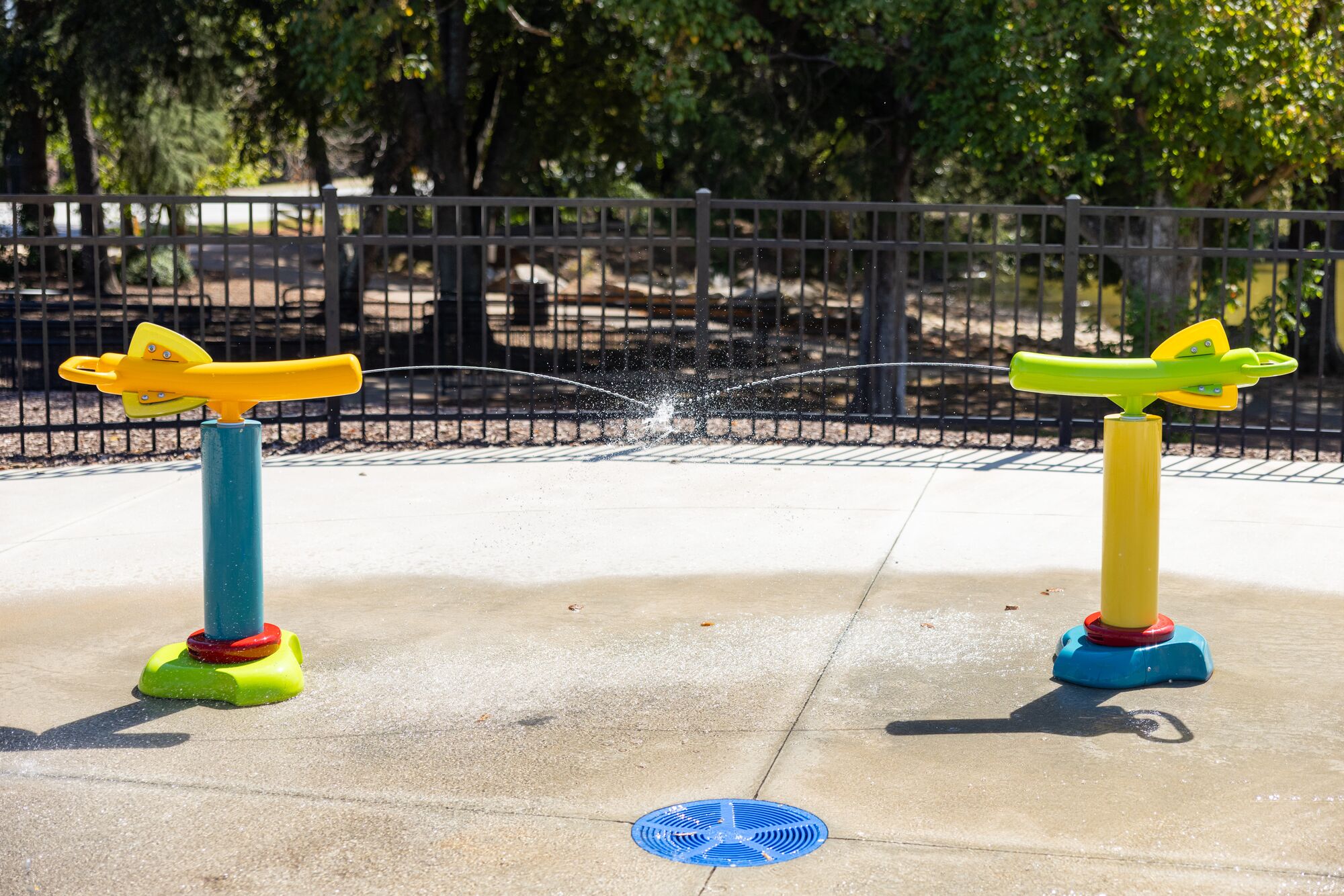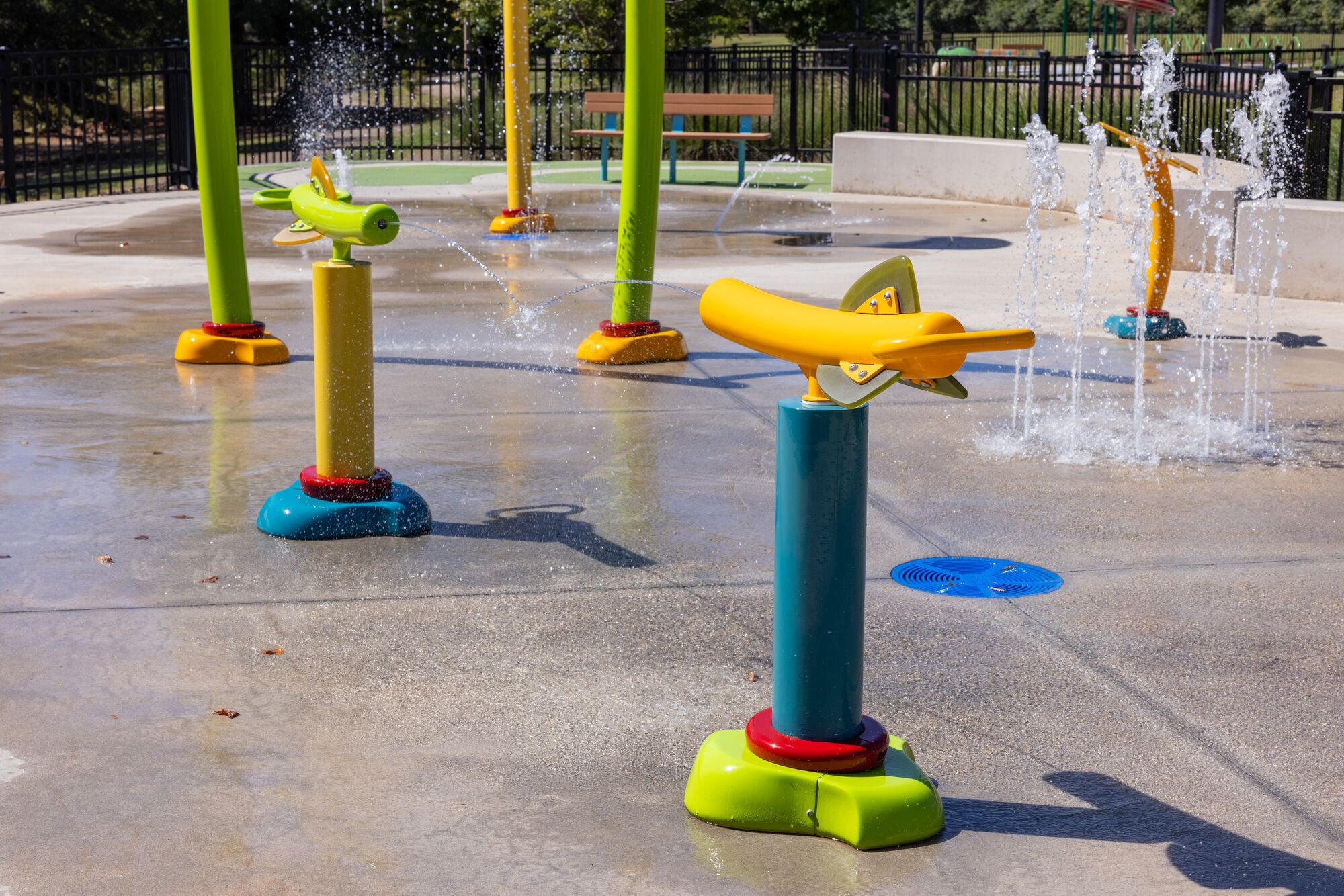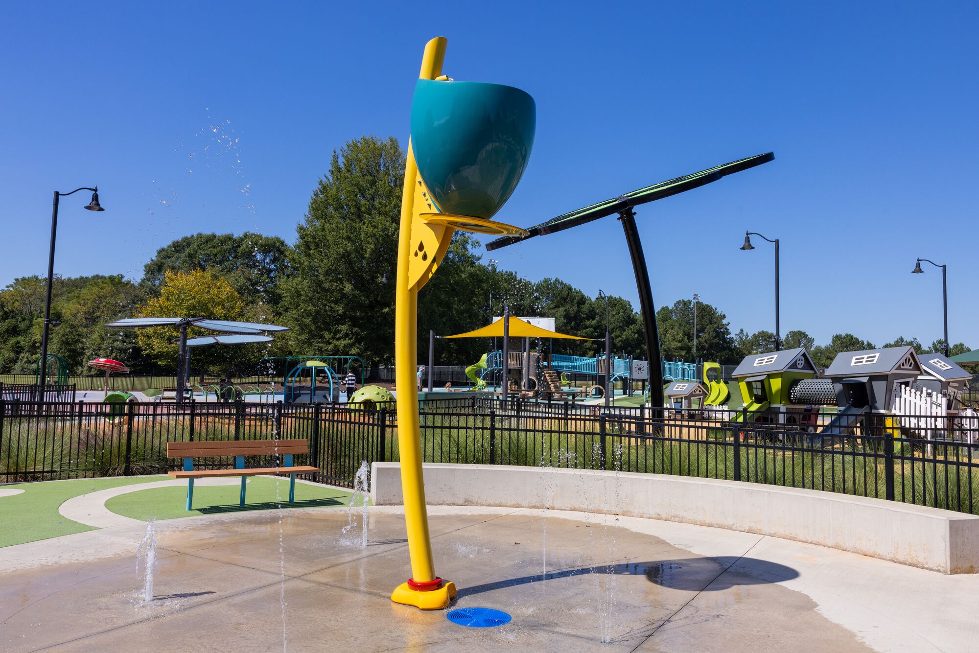 This sunny splash pad at KidVenture in Anderson, South Carolina uses nature-themed elements to bring splash play to life. Children can choose their level of soaking from above as the overhead DragonFlier sprays a gentle shower while the Mini FlashFlood overturns a gushing bucket from above. The WaterWay allows kids to move under the shower fast or slow, while features like the twin JetStreams offer interactive water fun, where friends can “tag” each other with a refreshing stream. The FloraSwirl provides more nature-themed water fun, and mirrors a flower-shaped SkyWays® shade structure that arches overhead. Finally, ground sprays of various strengths and textures keep curious children engaged and exploring. This splash pad is adjacent to a flower-themed Landscape Structures playground.